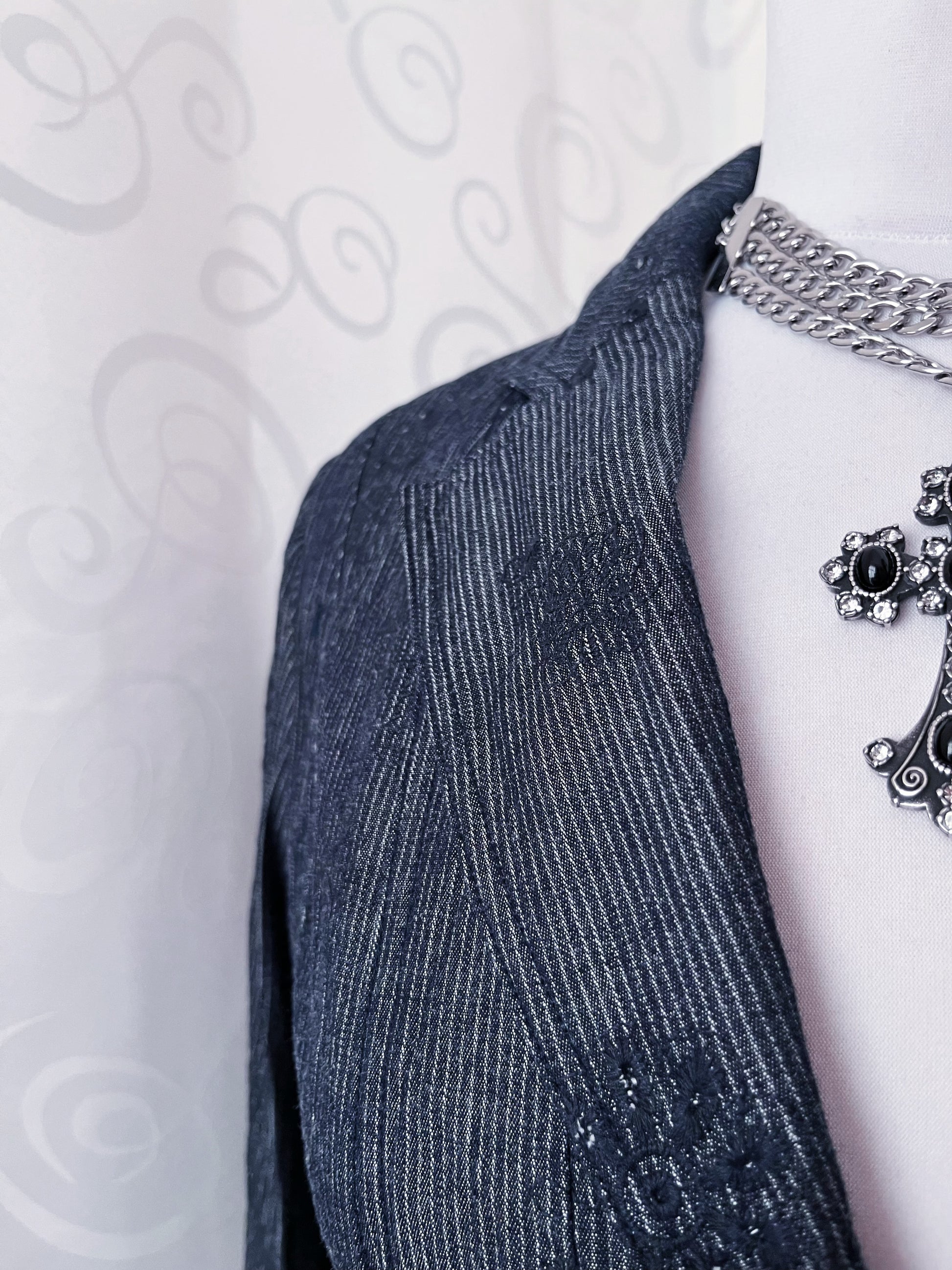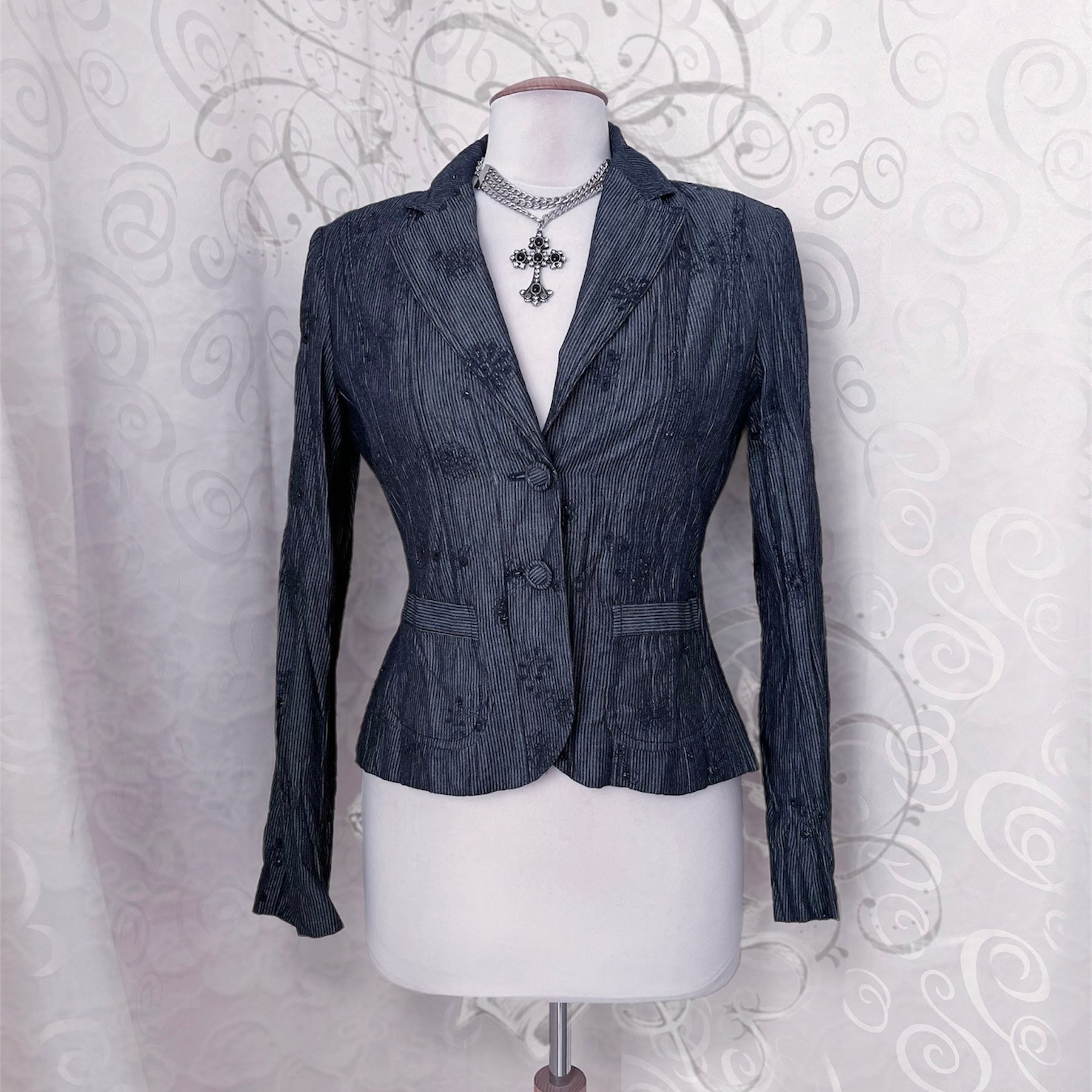 00’s whimsygoth striped & embroidered grey blazer 🌀🥀